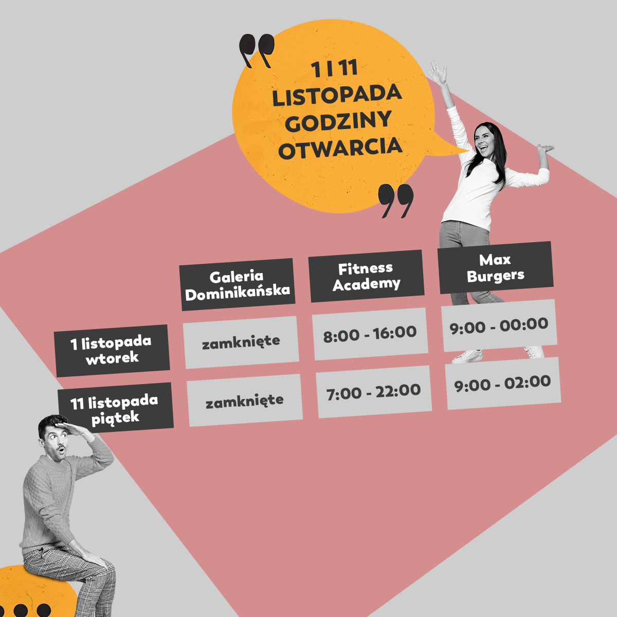 1 i 11 listopada nasze centrum jest nieczynne, ale na miłośników sportu czeka @fintessacademy, a fanów burgerów zaprasza @maxburgers!