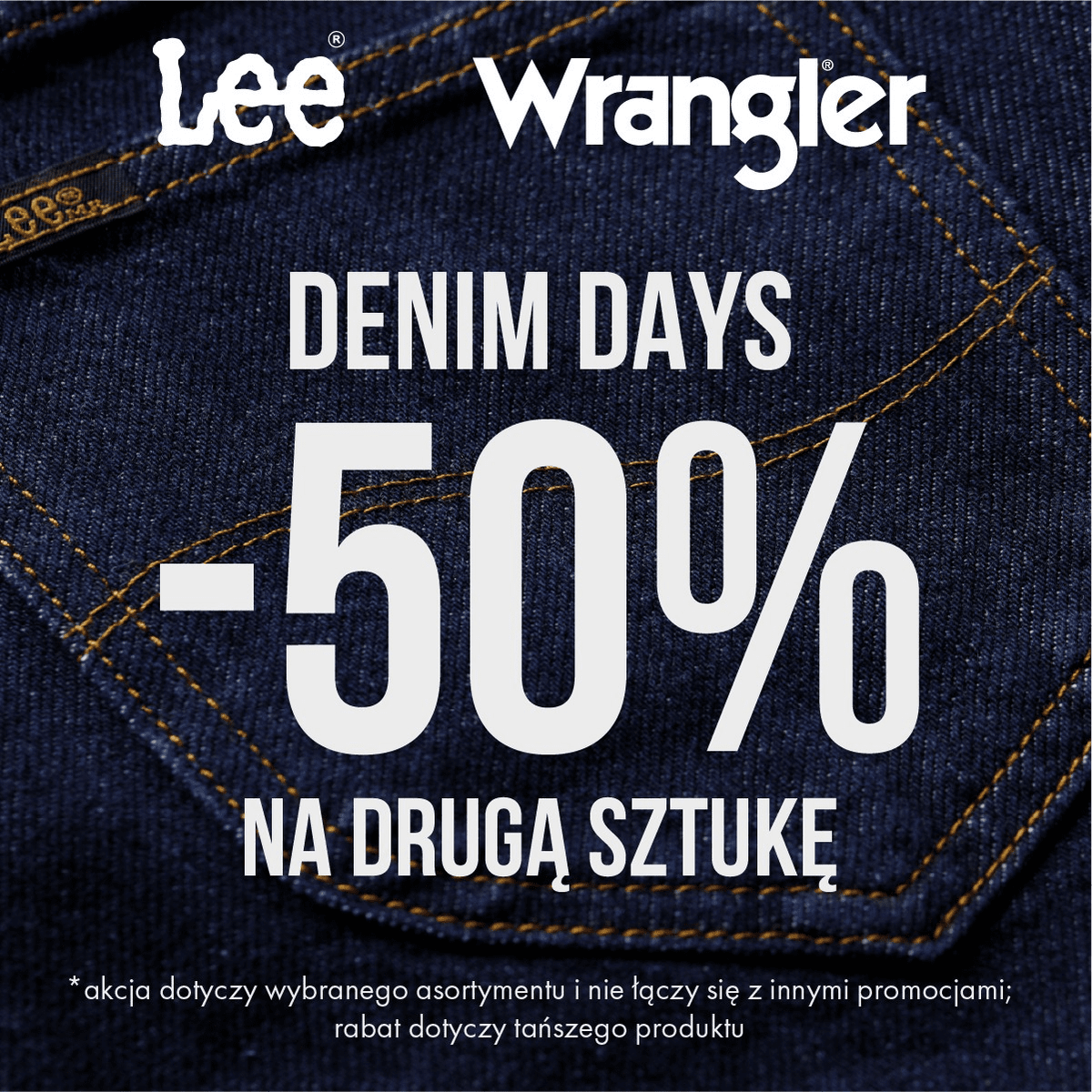 Klient przy zakupie 2 szt produktów denim (spodnie, szorty, koszula, koszulka, kurtka) otrzymuje rabat -50% na drugi, tańszy produkt