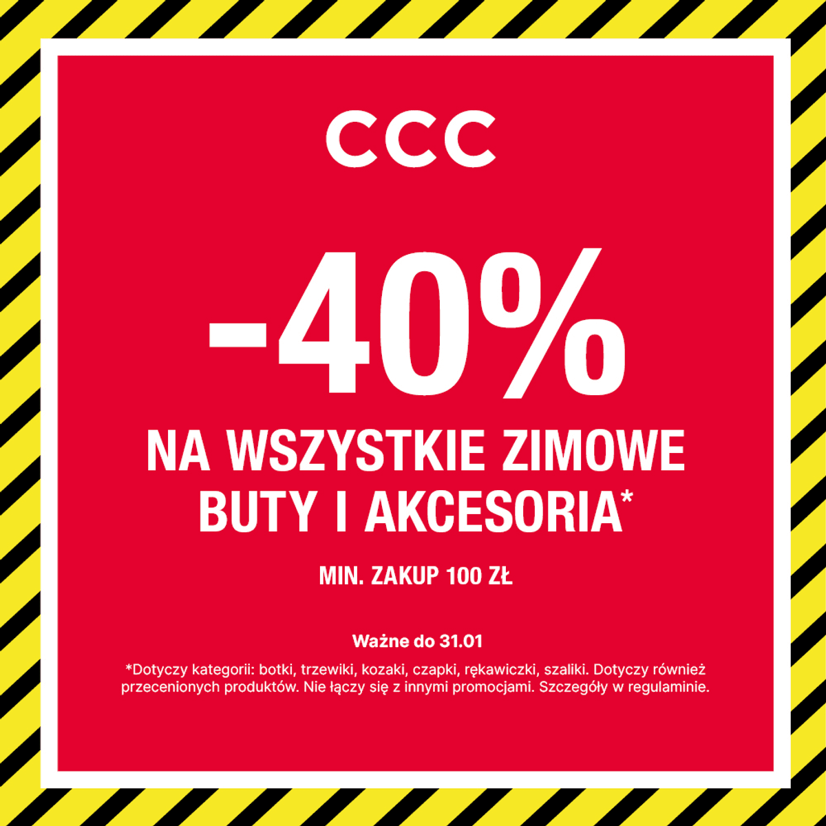 Mega okazja! W CCC aż -40% na całą kolekcję zimową! Botki, kozaki, trzewiki i akcesoria — nawet przecenione. Rabat aż 40% przy zakupach za min 100 zł. Tylko w salonach CCC. Szczegóły w regulaminie
