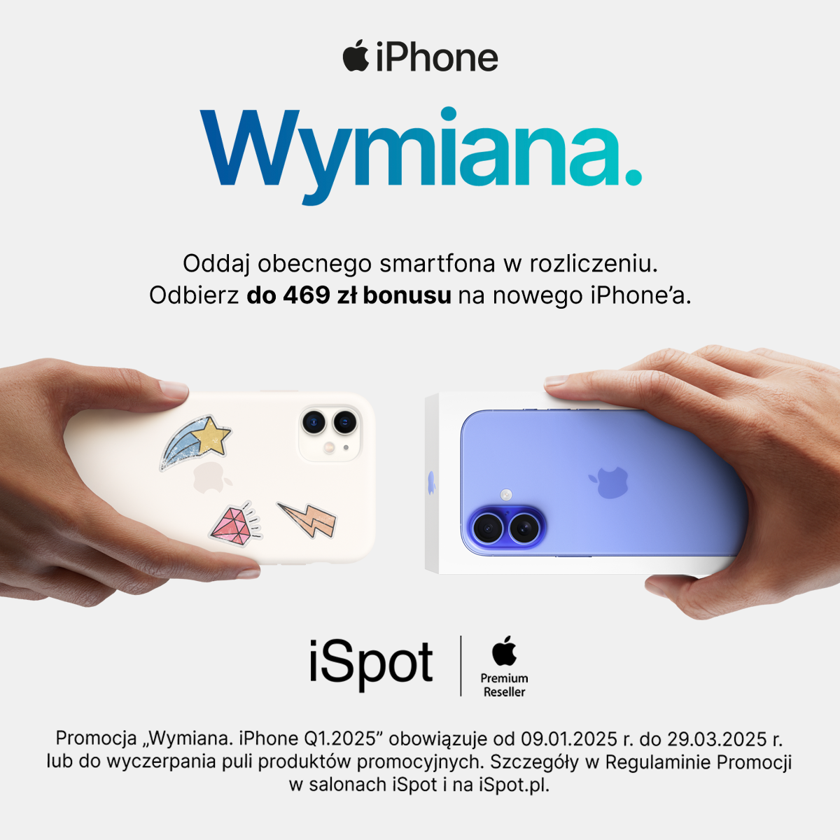 * Bonus od iSpot w wysokości 469 zł przy wymianie na iPhone 16, iPhone 16 Plus, iPhone 16 Pro, iPhone 16 Pro Max lub 246 zł przy wymianie na iPhone 15, iPhone 15 Plus, iPhone 14 lub iPhone 14 Plus.